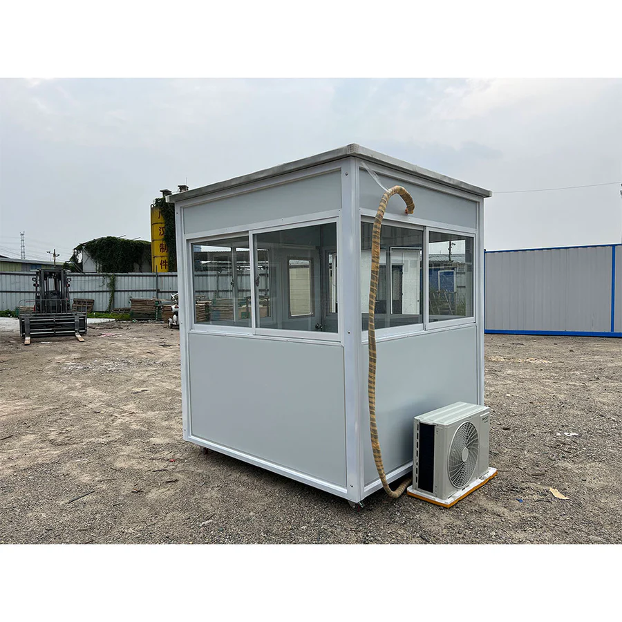 Safety and Stability: The floor includes a galvanized anti-slip plate atop a magnesium oxide board, ensuring stability and safety while minimizing the risk of fading over time. Guard Booth For Sale 6.5×6.5ft Light Gray With AC and Heating
