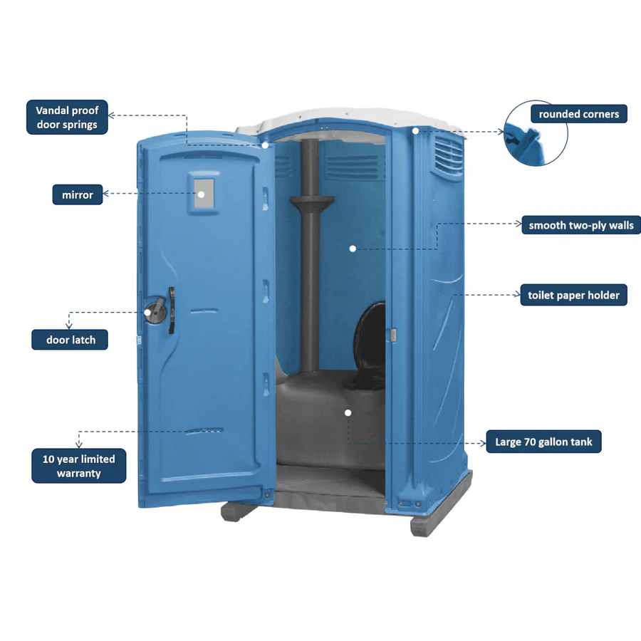 Designed for convenience and ease of use, the Maxim 3000™ boasts deep corner grips, vandal-resistant door springs, and thoughtful additions like a hanging hook, built-in shelf, and mirror. Its modern, sleek design makes it a preferred choice for both operators and end-users. For other great options, explore our Aspen Portable Restroom and Tufway Portable Restroom.